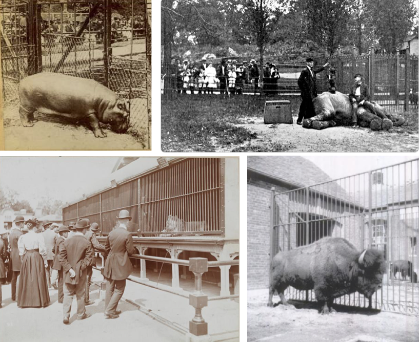 GETTING AWAY FROM IT ALL…Postcard image of the Menagerie in Central Park, New York, 1905. (Museum of the City of New York—MCNY)ANIMAL ATTRACTION…Postcard image of folks enjoying caged birds at the Menagerie, 1905. (MCNY)O GIVE ME A HOME…In the early days of zoos, animals were presented in cages and fenced enclosures with no hint as to what their natural habitat might look like. Clockwise, from top left, “Fatima” the hippo, image from an 1896 stereograph card; a 1911 photo of a trainer and a dog perched on top of a hapless elephant; a bull bison around the turn of the century; a group of people observe animals in cages at the Central Park Menagerie, 1895. (Library of Congress/nycgovparks.org/MCNY)