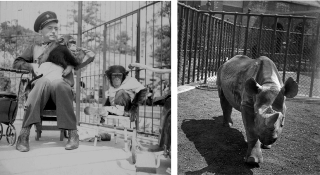 LIFE BEHIND BARS…Left, a zookeeper with chimps at the Central Park Zoo, 1936. Right, a rhino paces in a barred enclosure, 1937. (nycgovparks.org)