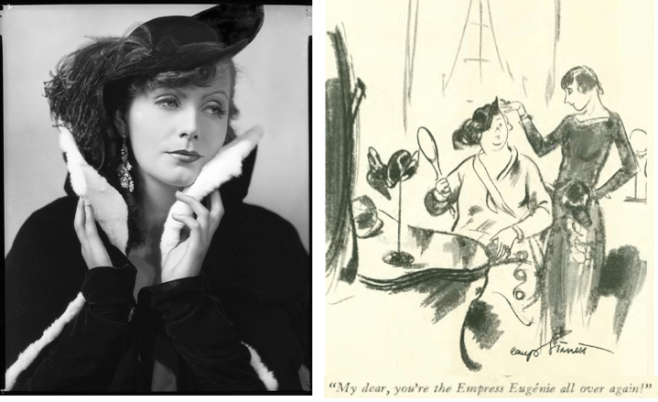 LOOK WHAT YOU STARTED…Greta Garbo sported an Empress Eugénie hat in the 1930 film Romance, setting off a fashion craze that persisted through much of the decade. At right, Kemp Starrett referenced the trend in this Aug. 8, 1931 cartoon in The New Yorker. (Pinterest)