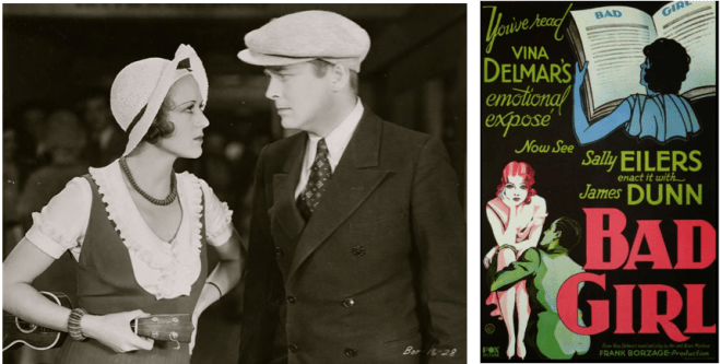 I’M JUST A LITTLE BAD…Sally Eilers played the title character in Bad Girl with co-star James Dunn. The film won two Oscars in 1932 for Best Director (Frank Borzage) and Best Writing, Adaptation (Edwin J. Burke). (IMDB)