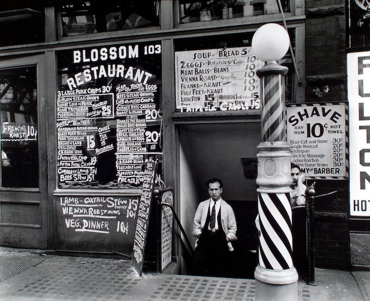 NOT MUCH TO SMILE ABOUT…Berenice Abbott photograph of a Bowery restaurant in 1935, when the street was lined with flophouses. (Wikipedia)