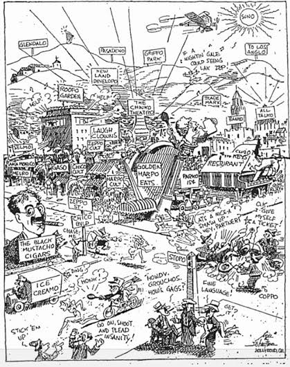 MAKE ‘EM LAUGH…Writer and cartoonist Will B. Johnstone (left) wrote the screenplay for Monkey Business with S. J. Perelman, right, in a 1935 portrait by Ralph Steiner. (Meg Farrell/Yale University)A promotional cartoon for Monkey Business by Will B. Johnstone. He also created the cartoon character of The Tax Payer wearing only a barrel held up by suspenders. It was a regular feature in the New York World-Telegram. (Meg Farrell via travsd.wordpress.com)