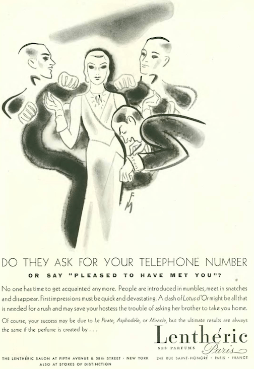 …illustrator Frank McIntosh, known for his Art Deco travel drawings, (and who contributed just four drawings to The New Yorker), gave us this stylish illustration for Guillaume Lenthéric’s famed parfums…
