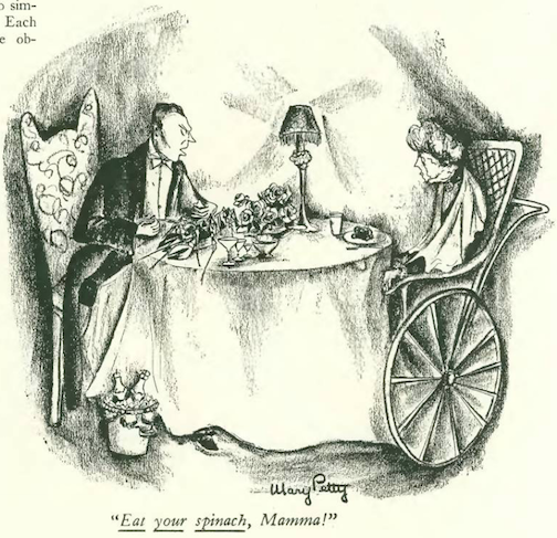 …this Mary Petty cartoon recalls Carl Rose’s famous “I say its spinach” cartoon—and Mamma has every right to say “the hell with it” in this case…