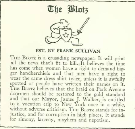 …where we find the latest edition of Frank Sullivan’s satirical newspaper, The Blotz, which occupied a two-page spread (excerpt below)…