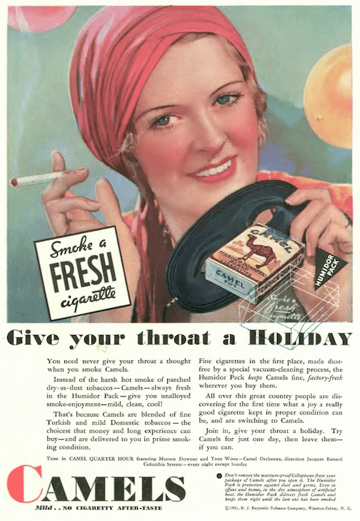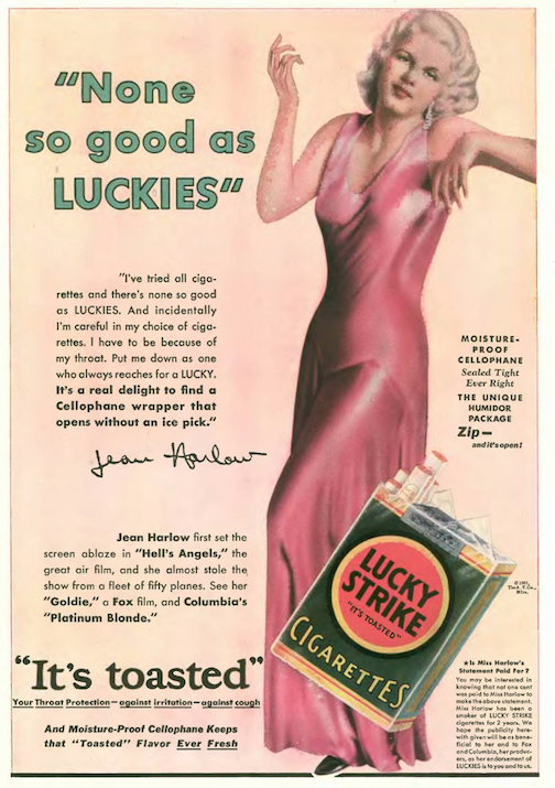 …and this ad for Lucky Strike cigarettes, featuring 20-year-old Platinum Blonde star Jean Harlow (what is she leaning on?) who probably shouldn’t have smoked because her health was always a bit fragile—she would be dead in less than six years…