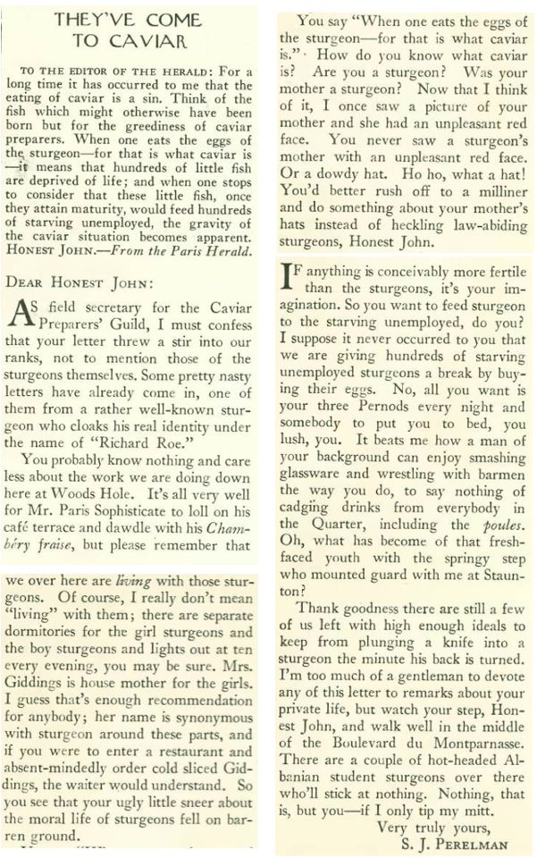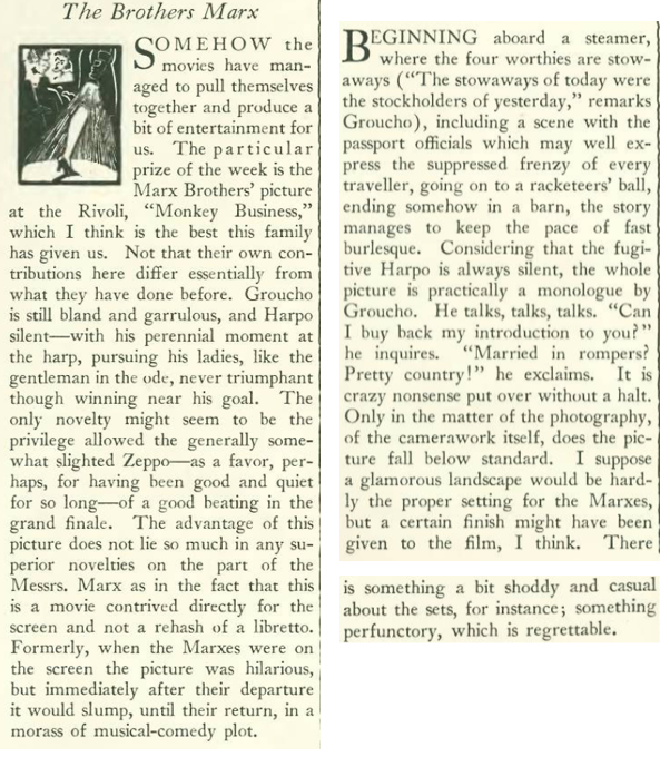 There was a New Yorker connection to Monkey Business — S. J. Perelman‚ a frequent contributor of humorous shorts to the magazine, was one of the screenwriters for the film. And it just so happens that one of Perelman’s shorts was in the Oct. 17 issue, and it was a doozy…