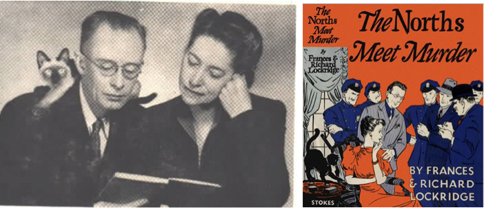 PARTNERS IN CRIME…Richard and Frances Lockridge examine one of their mystery novels in this undated book jacket photo. At right, the cover of their second “North” book, with cover illustration by Helen Hokinson (note the similarities of the Mr. and Mrs. North characters to Richard and Frances).