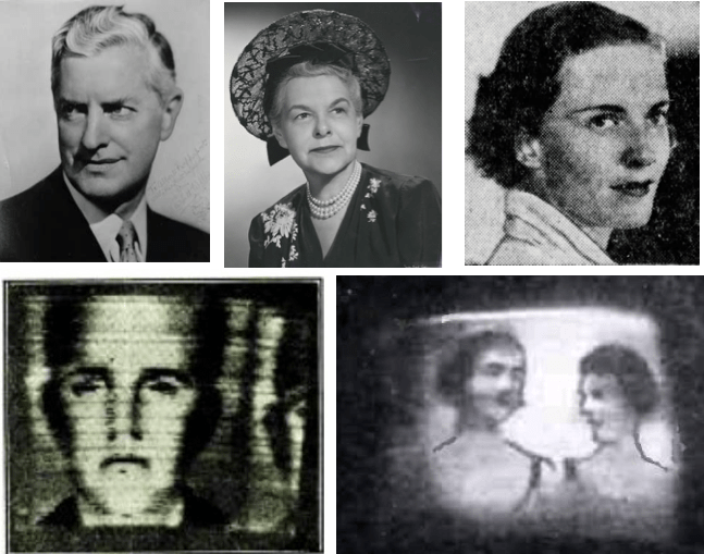 CAN YOU SEE ME NOW?…Top row, left to right, British adventurer Carveth Wells and actresses Theresa Helburn and Margaret Barker did their best to entertain audiences a block away via a television broadcast, but the results were more like the images on the bottom row, particularly the one at right. (art-books.com/brynmawr.edu/onetuberadio.com)