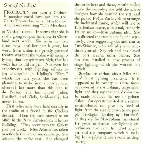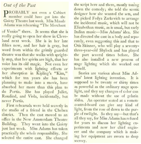 Not well known today, but in the early 20th century Maude Adams (1872-1953) was a household name; her touring productions beginning around the turn of the century made her the most popular actress in America, and she sealed that deal in 1905 when she played Peter Pan on Broadway to great acclaim. Her success continued until 1918, when the Spanish flu pandemic nearly claimed her life. After recovering from the illness she retired from acting and turned her attention to making improvements in electric lighting, creating an industry standard for both stage and film. When she returned to acting in 1931, it was big news, and “The Talk of the Town” was there to tell us about it. Excerpts: