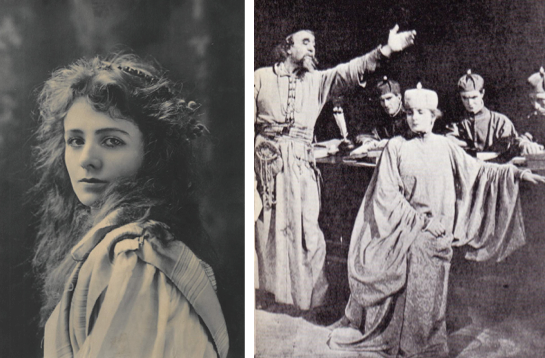 STAGING A COMEBACK…Maude Adams, left, circa 1897. At right, Adams portrayed Portia in her 1931 production of The Merchant of Venice, with Otis Skinner, who portrayed Shylock. (Pinterest/Bookmice)