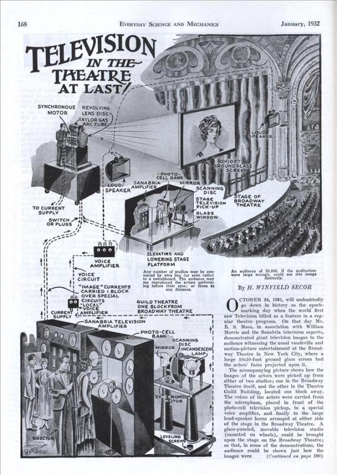 In “The Talk of the Town” White wrote about the unusual demonstration of television to an audience in the B.S. Moss playhouse. They were treated to a broadcast from the Guild Theatre, just one block away.