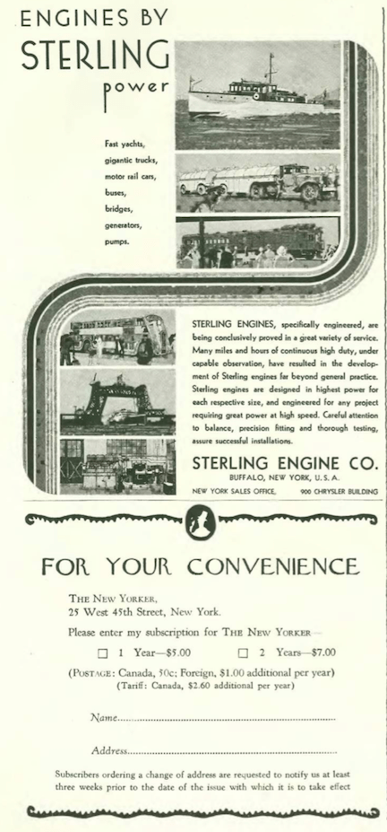 …our last ad is a most unlikely one from the Sterling Engine Company of Buffalo, New York, definitely an outlier among the other New Yorker ads…