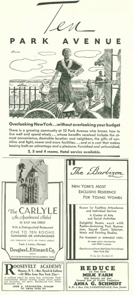 …perhaps you could wear one of the coats on a breezy day atop Ten Park Avenue…even this posh address felt the need to emphasize its affordability in those depressed times…also note the advertisement at the bottom for a “Milk Farm”…
