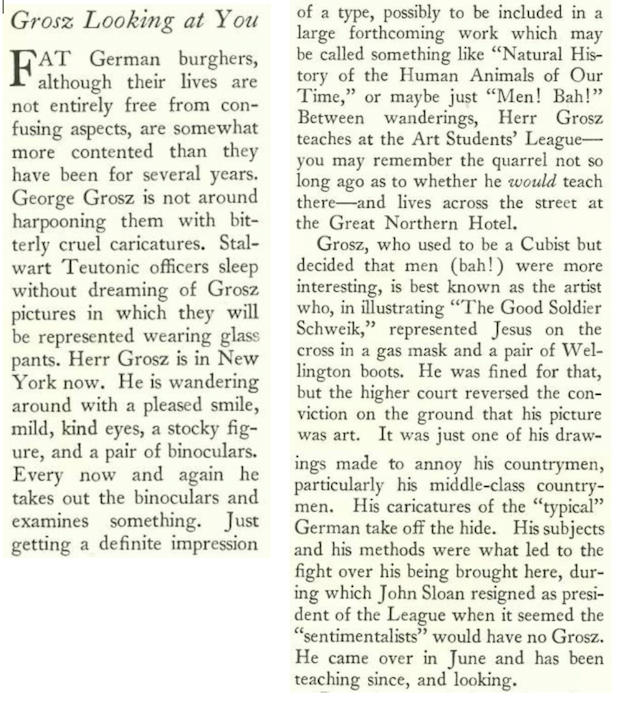 The German artist George Grosz (1893–1959) was perhaps best known for his bitter caricatures and paintings of Berlin’s Weimar years (roughly 1918 to 1933). In June 1932 he accepted an invitation to teach the summer semester at the Art Students League of New York, then briefly returned to Germany before emigrating to the U.S. with his family in January 1933.