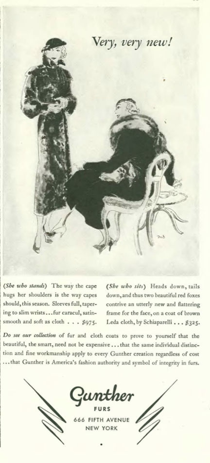Back in the day when it was still acceptable to drape dead animals around your neck, Gunther Furs offered these ensembles…the coat at left would cost the equivalent of $17,000 today…