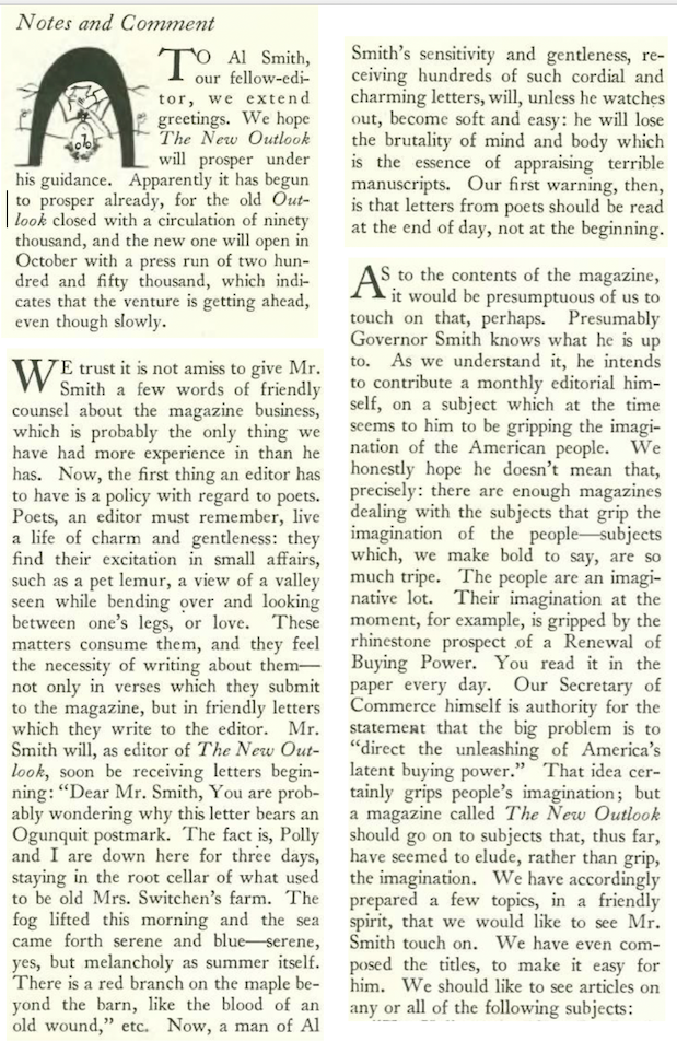 …which Smith used as a platform to attack his Democratic rival, and, particularly the New Deal policies following Roosevelt’s successful election to the White House. The election was still a couple months away when E.B. White offered these observations about Smith’s new publishing venture: