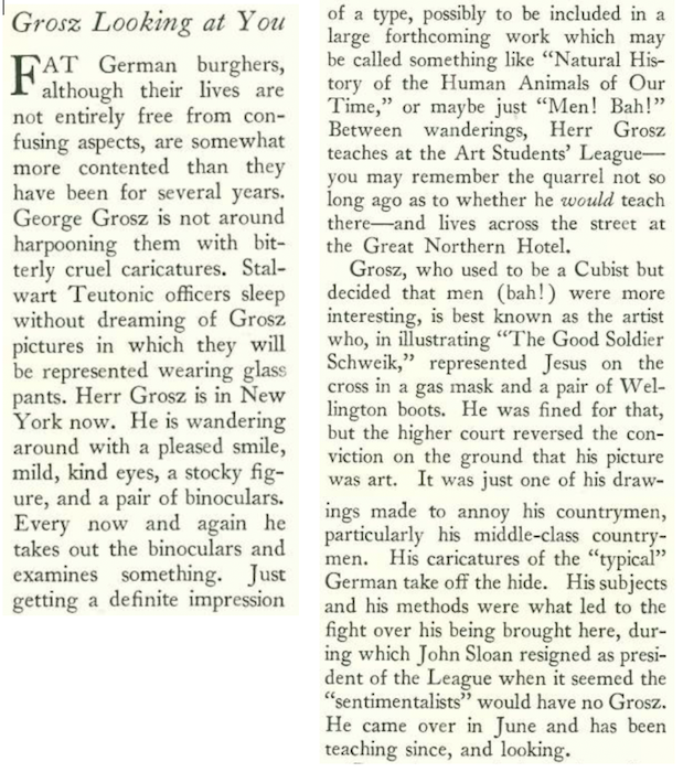 The German artist George Grosz (1893–1959) was perhaps best known for his bitter caricatures and paintings of Berlin’s Weimar years (roughly 1918 to 1933). In June 1932 he accepted an invitation to teach the summer semester at the Art Students League of New York, then briefly returned to Germany before emigrating to the U.S. with his family in January 1933.