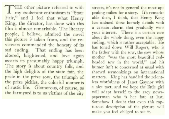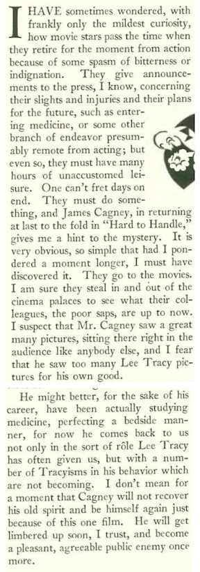 New Yorker film critic John Mosher preferred the tough guy Cagney to the toe-tapping version, and was anticipating Cagney’s return to pictures after a contact dispute with Warner in which he threatened to quit the business and follow his brothers into the medical profession…