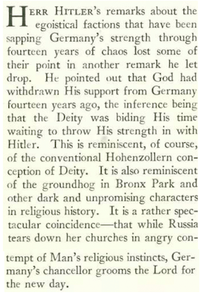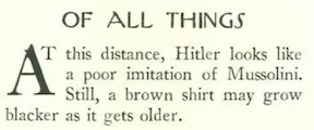 As we move into the 1930s we will be seeing more references to Adolf Hitler, who seized power in Germany on January 30, 1933. At this point “The Talk of the Town” wasn’t taking him seriously…