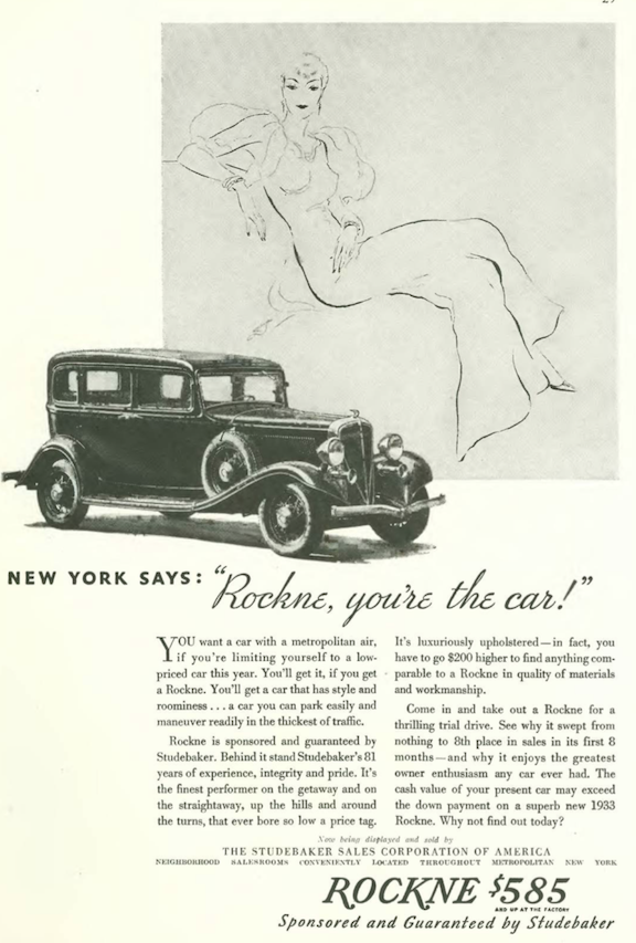 …no, New York did not say “Rockne, you’re the car!”, even if it was juxtaposed with a giant woman…the car was named for famed football coach Knute Rockne, and the Depression was not a good time to promote a new car line…it was produced from 1932 to 1933, when Studebaker pulled the plug and sold the remaining inventory (about 90 cars, packaged in kits) to a Norwegian railroad car manufacturer…