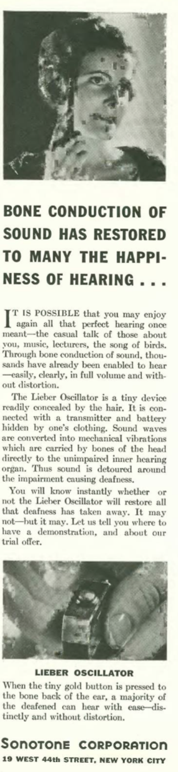 …this ad from Sonotone Corporation promoted a new hearing aid developed by Hugo Lieber…this revolutionary bone conduction receiver enabled the deaf to hear through bones in their head…