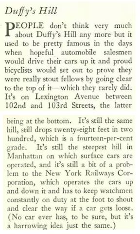 Located on Lexington between 102nd and 103rd streets, Duffy’s Hill was once famous for being the steepest hill in Manhattan and the scourge of street cars that had to quickly accelerate and decelerate at that point, leading to numerous accidents. An excerpt from “The Talk of the Town”…