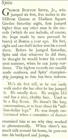 George Spitz Jr was an AAU high jump champion when he participated in the 1932 Summer Olympics in Los Angeles. In 1933 he made a personal best leap of 6 feet, 8¼ inches using scissors-style leap with elements of the Western roll. “The Talk of the Town” marveled at Spitz’s feat, giving him an extra quarter inch for his record leap: