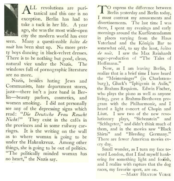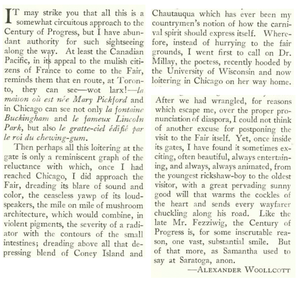 In his “Shouts & Murmurs” column, Alexander Woollcott recounted his trip to Chicago, ostensibly to see the Century of Progress (the 1933 World’s Fair) but was sidelined along the way by various diversions, including a visit with poet Edna St. Vincent Millay. An excerpt: