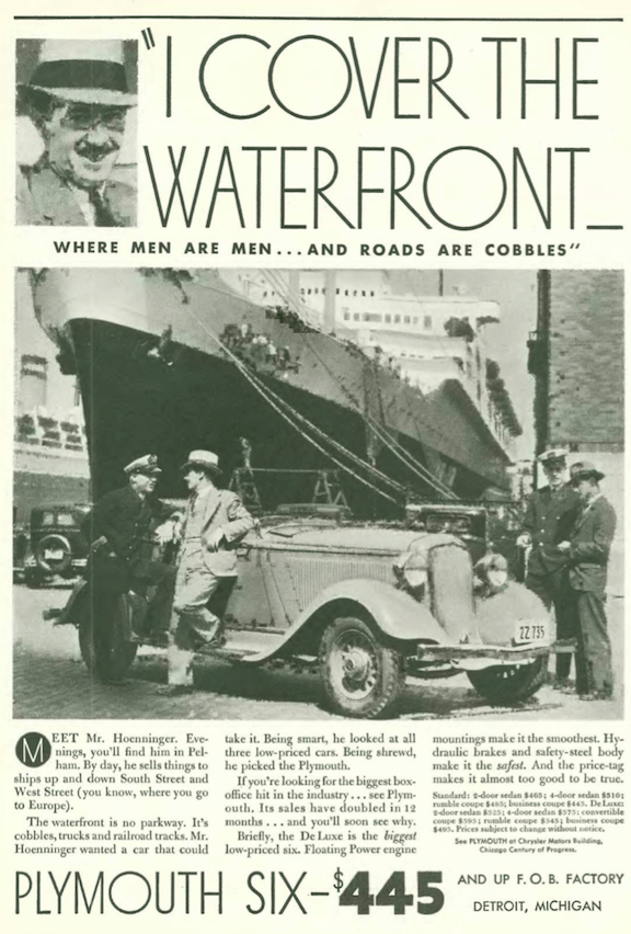 …recalling the Packard ad from the previous issue, the cheapest Packard model would set you back $2,150…you could instead get this swell Plymouth Six for just $455 and head down to the waterfront, where, according to this salesman, “men are men”…