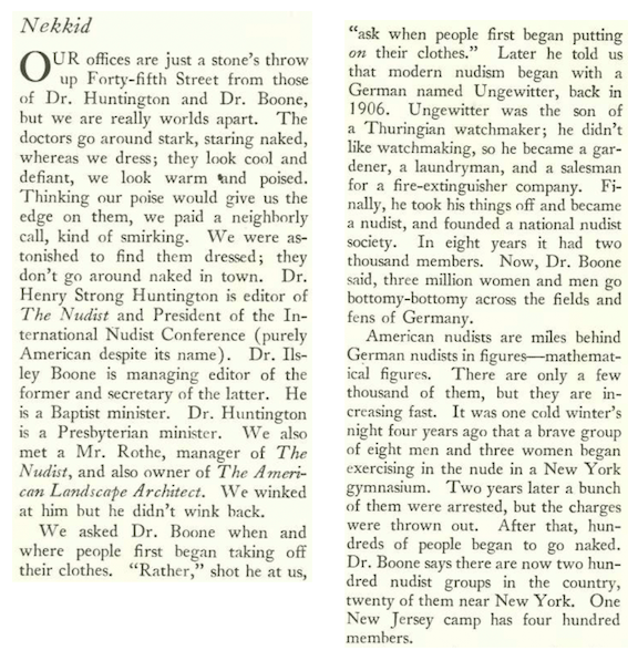 Once upon a time a Baptist and a Presbyterian got together and created a magazine promoting nudism. The Baptist, Ilsley Silias Boone (1879–1968), was founding father of the American Sunbathing Association—later reorganized as the American Association for Nude Recreation. His ally in advancing the cause of nudism, Presbyterian minister Henry Strong Huntington Jr (1882-1981), was the first president of the International Nudist Conference. “The Talk of the Town” laid bare the world of these randy clergymen.
