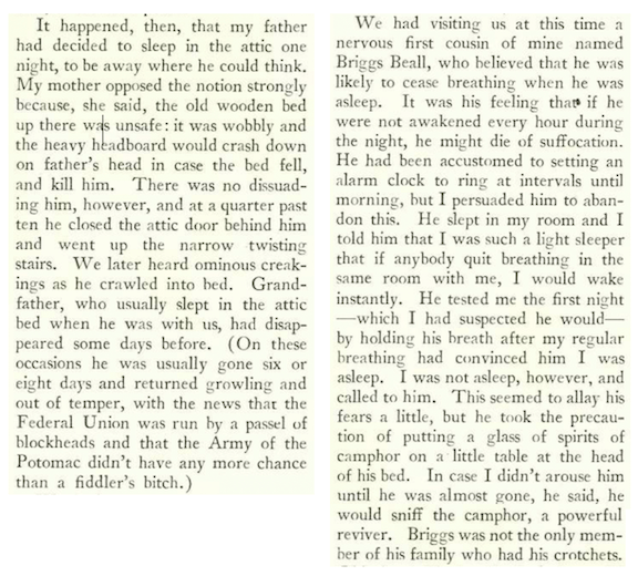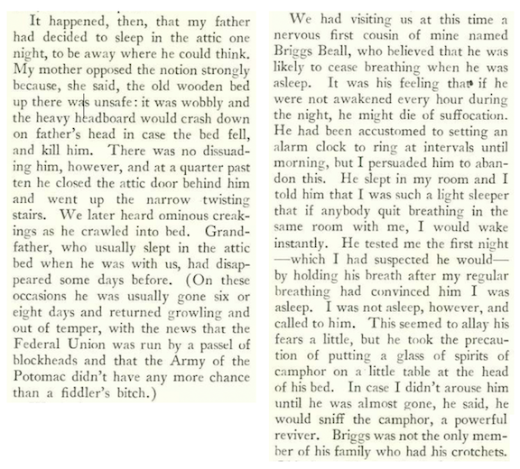 And what a beginning. “The Night the Bed Fell In” recounts the comically absurd events that took place in the wee hours at the Thurber family home in Columbus, Ohio. Beginning with his father’s decision to sleep in the attic, the story introduces a cast of characters including cousin Briggs Beall and his mother, Clarissa. Excerpts: