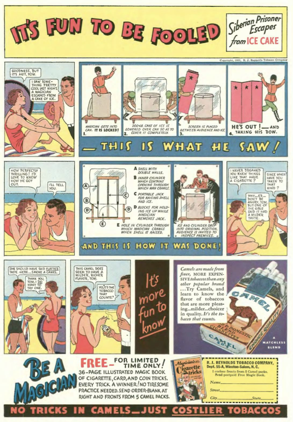 …Gluyas Williams referenced the Camel cigarette ads from 1933 that revealed the secrets of popular magic tricks…