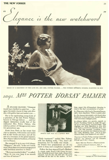 …we’ve encountered her before—she appeared in a Ponds ad (below) in the Aug. 8, 1931 issue of the New Yorker, where we learned she was wife No. 2 of Potter d’Orsay Palmer, son of the wealthy family of Chicago Palmer House fame…they would divorce in 1937, and the playboy Potter would marry two more times before dying of a cerebral hemorrhage in May 1939—following a drunken brawl in Sarasota, Florida with a meat cutter called Kenneth Nosworthy. Maria Eugenia would remarry and return to her homeland of Argentina to raise a family…