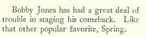 The founder of perhaps the world’s most prestigious golf tournament was an amateur and a working lawyer by profession. When Bobby Jones (1902–1971) co-founded the Masters Tournament in 1934 with investment dealer Clifford Robert, it was called the Augusta National Invitation Tournament (it was Robert’s idea to call it The Masters, a name Jones thought immodest). Jones dominated top-level amateur competition from the early 1920s through 1930—the year he achieved a Grand Slam by winning golf ’s four major tournaments in the same year. However, by the 1934 Jones’s skills began to wane. The New Yorker had little to say about the first Masters (it wasn’t a big deal yet), other than Howard Brubaker making this observation in “Of All Things”…