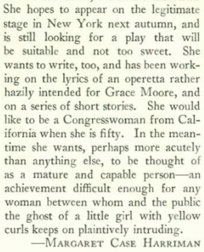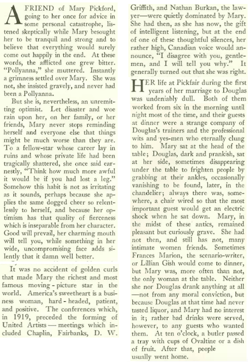 A note on the profile’s writer, Margaret Case Harriman (1904-1966), who doubtless sharpened her people-watching skills at the Hotel Algonquin (famed birthing ground of the New Yorker), which was owned by her father, Frank Case. Douglas Fairbanks was one of Case’s best friends, and Harriman knew both Fairbanks and Pickford well, since they often stayed at the hotel.