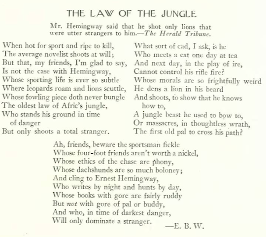 …speaking of F. Scott Fitzgerald, fellow author Ernest Hemingway defended Fitzgerald’s writing, arguing that criticism of his Jazz Age settings stemmed from superficial readings. One then wonders what Hemingway thought of E.B. White’s poetic “tribute” to his big game hunting excursions…