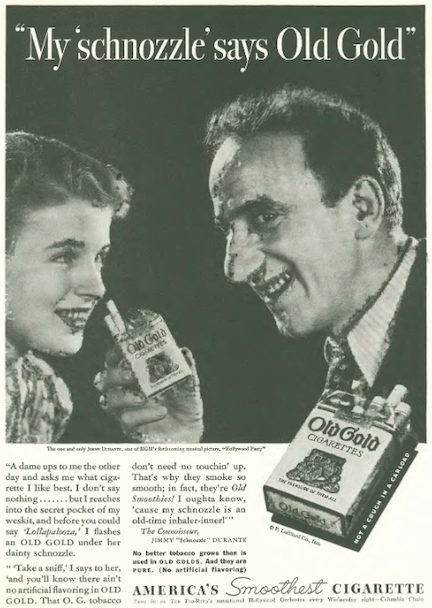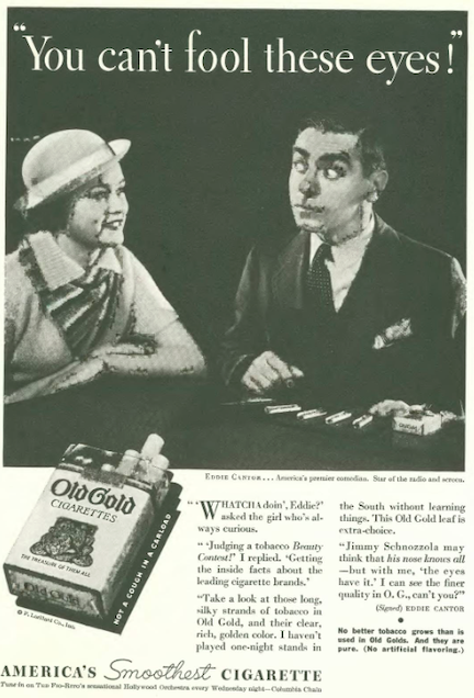 …the makers of Old Gold referenced a previous ad featuring Jimmy Durante with a new spot starring actor/comedian Eddie Cantor…both ads depicted impressionable young women admiring the smoking wisdom of older men…