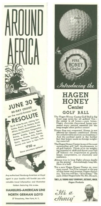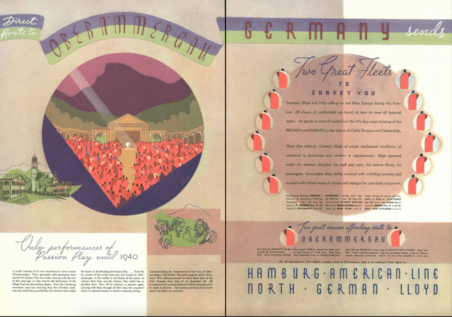 …those looking for a different kind of entertainment could have been enticed by this lavish center-page spread from German ocean liner companies…they were inviting Americans to Oberammergau, Germany to witness the “only performances of the Passion Play until 1940″…the play was usually performed every ten years (years ending in the digit zero) but in 1934 a special performance was supported by the Nazi Party…incidentally, the 1940 play was cancelled due to World War II…