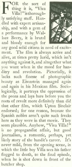 Film critic John Mosher declared David O. Selznick’s production Viva Villa! to be “thoroughly satisfying”—with a screenplay by Ben Hecht and starring actor Wallace Beery as Mexican revolutionary Pancho Villa, the film was considered violent and bloody by 1934 standards.