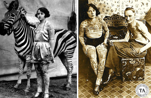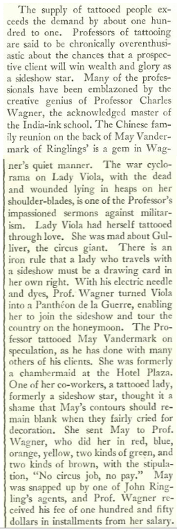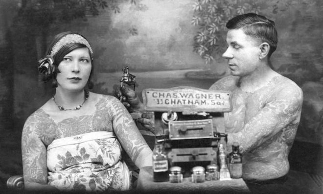 MARKED FOR LIFE…Alva Johnston noted such celebrated tattooed ladies as Mae Vandermark (left, circa 1920s), and Lady Viola, pictured at right with tattoo artist Fred Clark, 1930s. (Vintage Everyday)INKSLINGER…Charlie Wagner, a tattoo artist who lived from 1875 to 1953, is considered one of the kings of American tattooing. Practicing his art in New York’s Bowery, he not only developed an influential art style; he invented new machinery that helped spread the art of modern tattooing. (nyctattooshop.com)