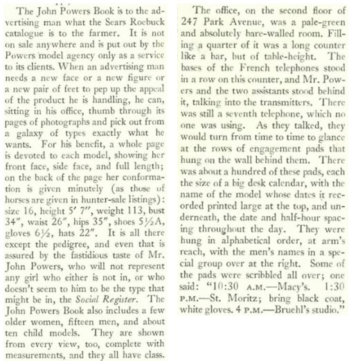 Writing for “A Reporter at Large” under the title “Perfect 36,” frequent New Yorker short story contributor Nancy Hale (1908 –1988) looked into the mysteries behind the fabled “John Powers Book” and its collection of sophisticated models.