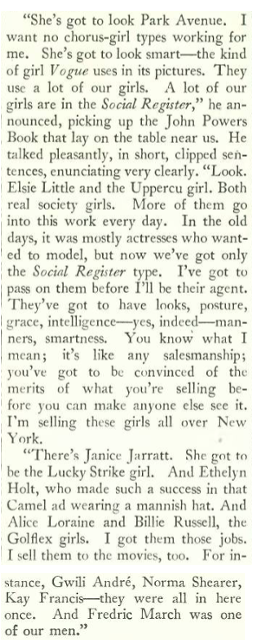 Hale was given a tour by a company representative who described the types of women the Powers company represented, noting the successes of women who landed in major cigarette ads or went on to become Hollywood stars: