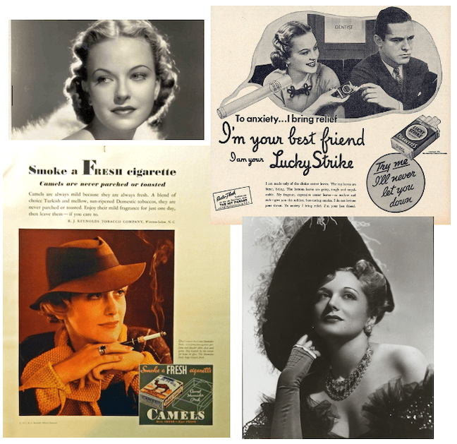 SMOKE AND MIRRORS…Clockwise, from top left: Powers model Janice Jarratt (in a 1934 publicity photo from her only film, Kid Millions), who for a time was known as the “Lucky Strike Girl” as well as the “most photographed woman in the world”; Jarratt offering a Lucky to a nervous young man in a 1935 ad; Powers model Ethelyn Holt in a publicity photo for the Billy Rose Theatre; Holt in a 1933 ad for Camel cigarettes. (MGM/NPR/NYPL/propadv.com)