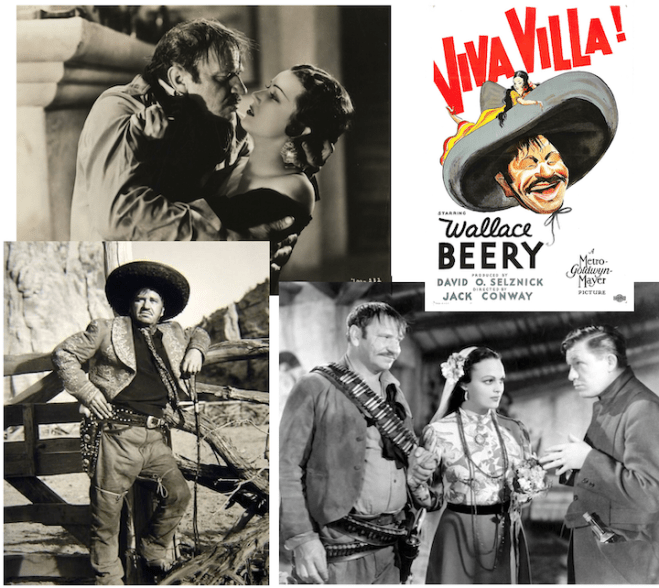 REVOLUTIONARY…Clockwise, from top left, Pancho Villa (Wallace Beery) finds himself attracted to a benefactor’s sister (Fay Wray); MGM film poster; Beery with Katherine DeMille (who was Cecil B. DeMille’s adopted daughter) and Stuart Erwin; Beery striking a pose on the set of Viva Villa! (IMDB)