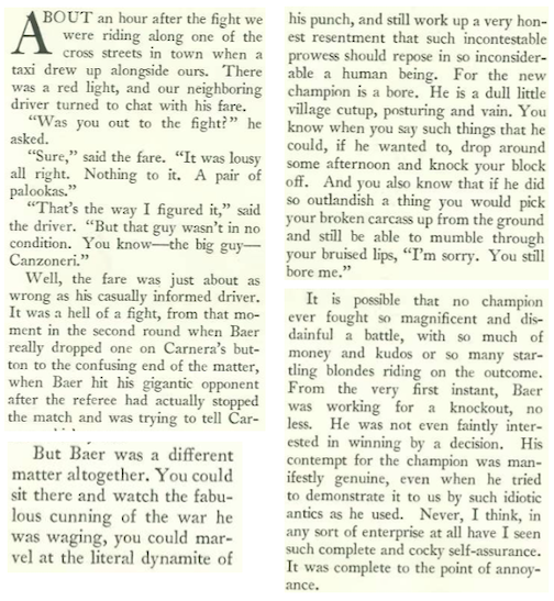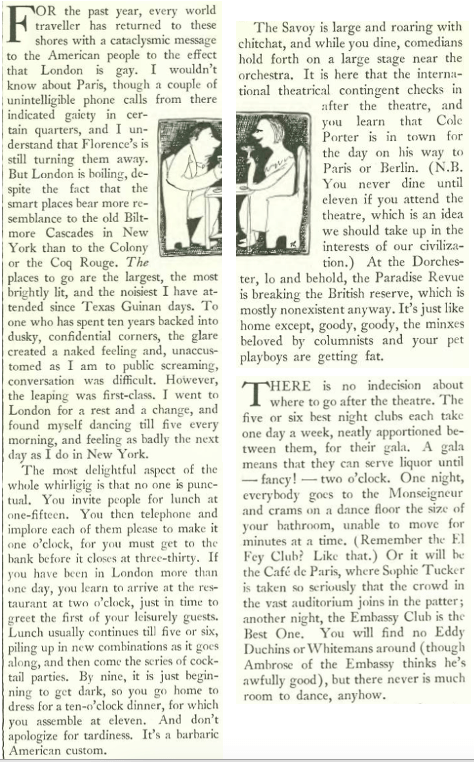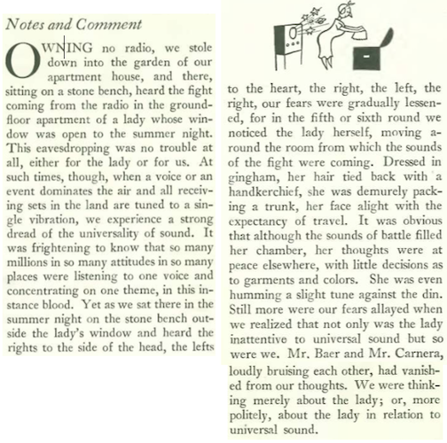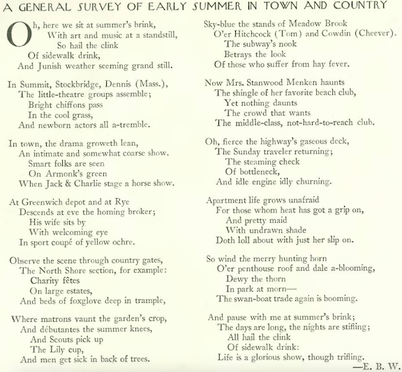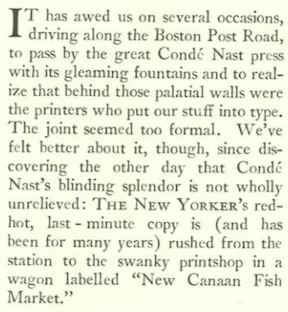 We settle in with the June 21 issue (which leads this post) with White once again, this time enjoying a drive to Stamford, Conn., where he admired the “splendor” of the Condé Nast printing plant (apparently the plant also printed The New Yorker, although the magazine itself would not be acquired by Condé Nast’s parent company, Advance Publications, until 1985).