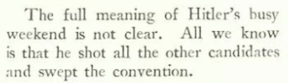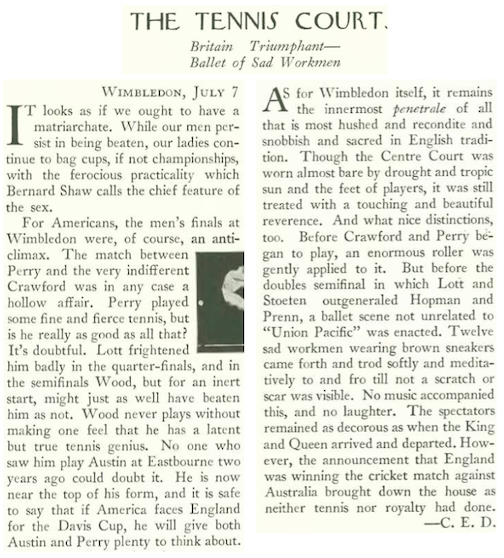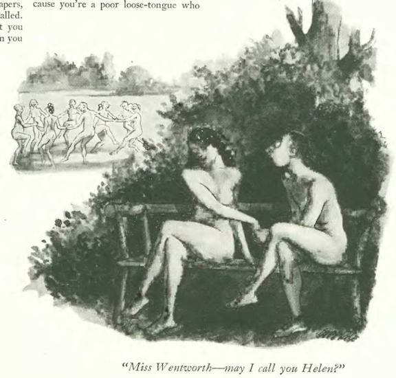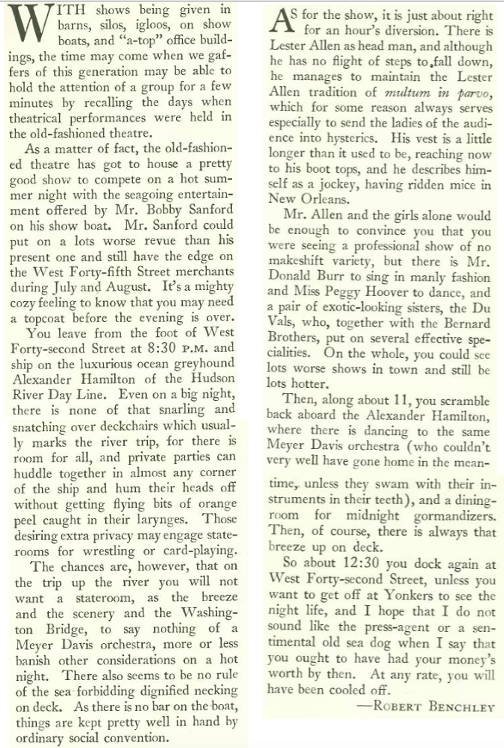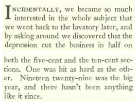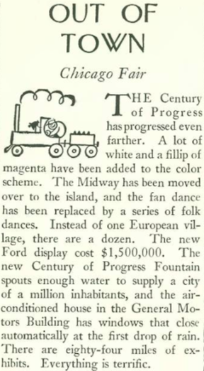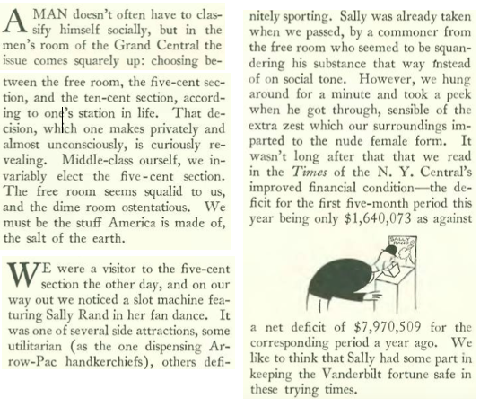 …but let us move ahead to the July 28 issue, where E.B. White was hopefully keeping his cool in the men’s waiting room at Grand Central Station, where he plunked down a nickel to cool his heels in the “middle class” section, where he observed side attractions including a vending machine that dispensed handkerchiefs and a coin-operated peep show featuring burlesque star Sally Rand.