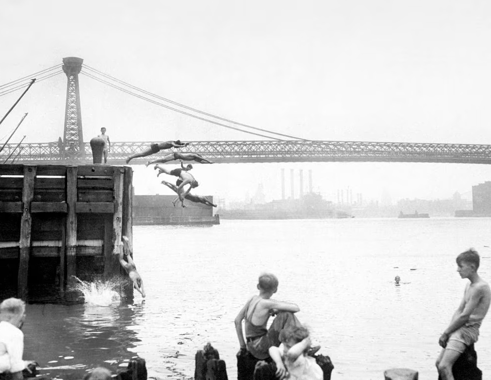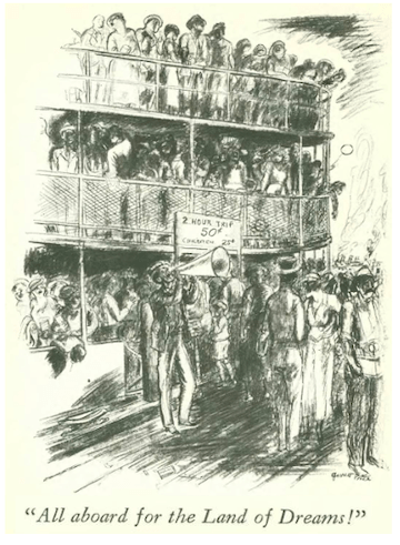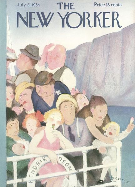 The heat wave of 1934 spread misery from the Midwest to the East Coast. The temperature in New York City hit 101 degrees F (38.3 C) on June 29, and July recorded at least ten days of temps in the mid- to upper 90s. It must have been miserable in the days before air-conditioning, and since no adult would dare be seen in public wearing shorts and a t-shirt, an outing on a crowded tour boat, as illustrated below by William Cotton, must have been hellish.