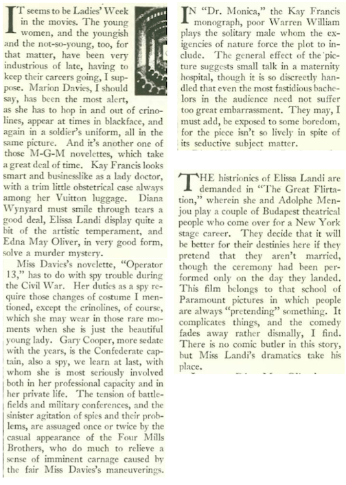 Film critic John Mosher was a fan of Disney’s “Silly Symphony” cartoon shorts, which were produced between 1929 and 1939. Animation, and especially color animation, was in its infancy, so these doubtless had an uplifting effect on many moviegoers.