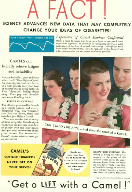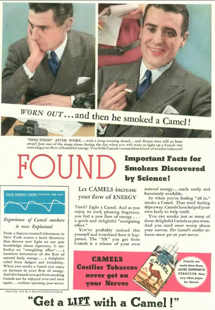 We begin with scientific proof (from a “famous research laboratory in New York”) that Camel cigarettes increased one’s flow of energy…